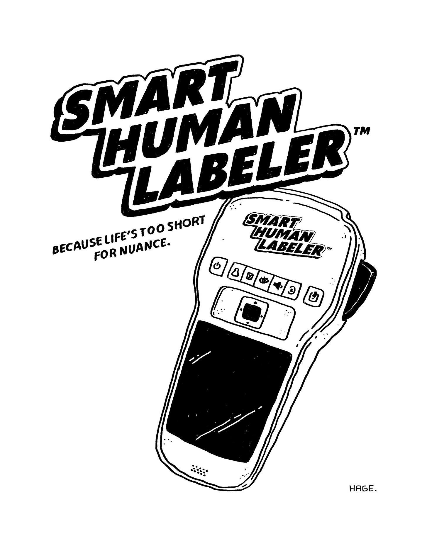 The Smart Human Labeler™ is not your average label maker. It’s an AI-powered handheld scanner that listens to the first three words someone speaks, or simply scans their appearance, and instantly produces a convenient label for them. Designed to preserve the human instinct to judge others on sight, now enhanced with automated hypocrisy to save you time and effort. The Smart Human Labeler™ is not futuristic. It’s late.